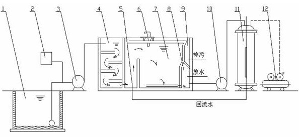 1. 調(diào)節(jié)池 2. 投凝劑設備 3. 污水泵 4. 折板聚凝池 5. 釋放器 6. 刮渣機 7. 氣浮池 8. 溶氣水存放池 9. 污泥池 10. 溶氣水泵 11. 溶氣罐 12. 空壓機