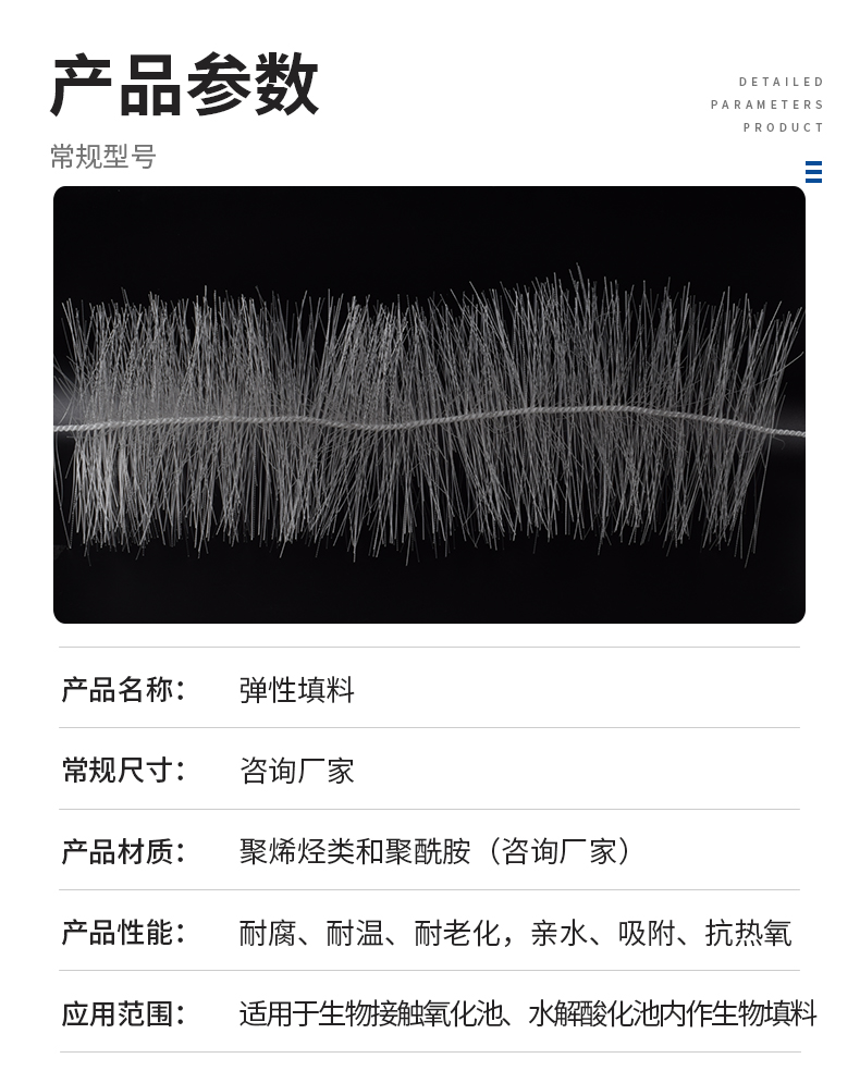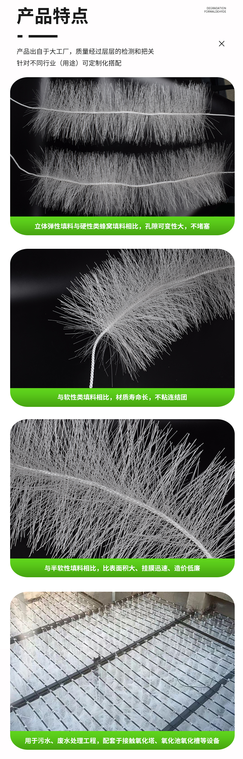 采用特殊的拉絲,絲條制毛工藝,將絲條穿插固著在耐腐、高強(qiáng)度的中心繩上,由于選材和工藝配方精良,剛?cè)徇m度,使絲條呈立體均勻排列輻射狀態(tài),制成了懸掛式立體彈性填料的單體,填料在有效區(qū)域內(nèi)能立體全方位均勻舒展?jié)M布,使氣、水、生物膜得到充分混滲接觸交換,生物膜不僅能均勻的著床在每一根絲條上,保持良好的活性和空隙可變性,而且能在運(yùn)行過程中獲得愈來愈大的比表面積。