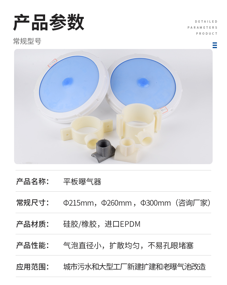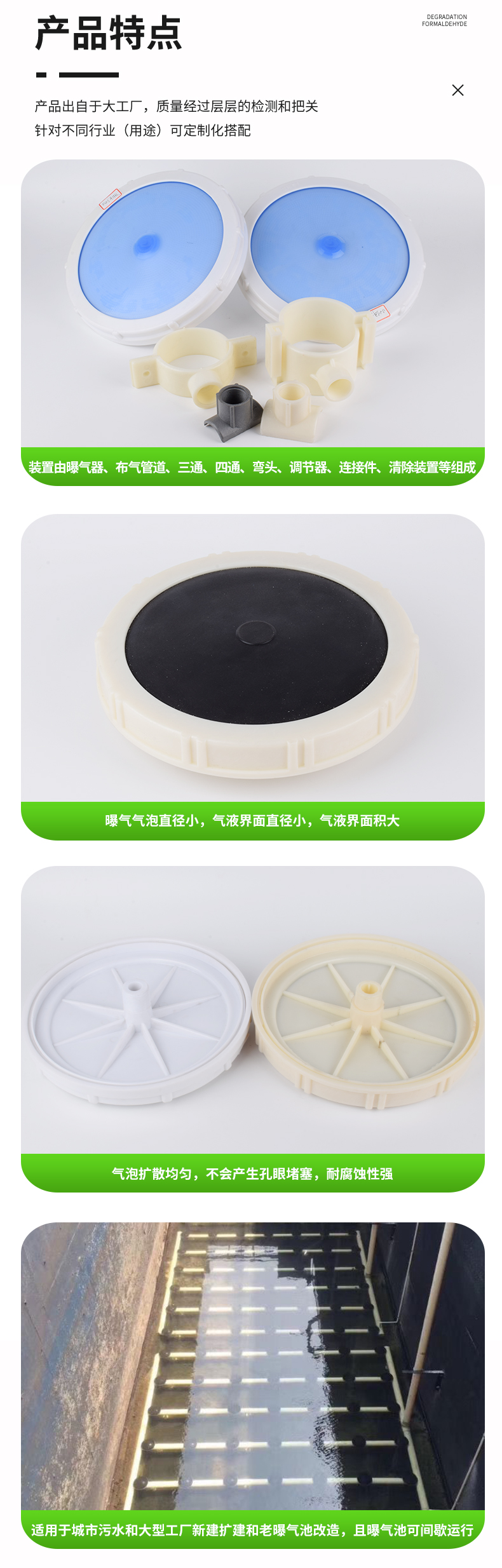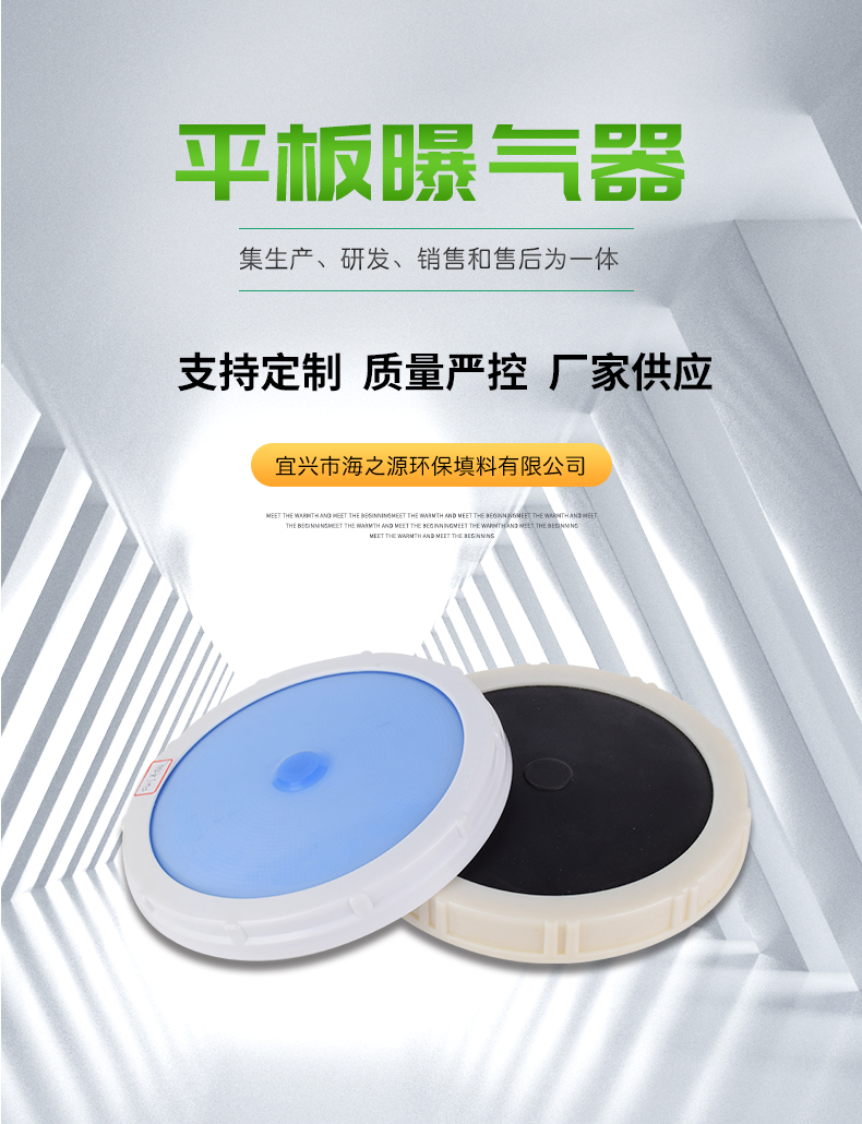 平板膜片曝氣器,該裝置曝氣氣泡直徑小,氣液界面直徑小,氣液界面積大,氣泡擴(kuò)散均勻,不會產(chǎn)生孔眼堵塞,耐腐蝕性強(qiáng),經(jīng)上海同濟(jì)大學(xué)環(huán)境工程學(xué)院和中國市政工程華北設(shè)計院進(jìn)行清水和污水充氧測試,并經(jīng)50多家用戶多年使用效果良好(比常規(guī)產(chǎn)品固定螺旋曝氣器,散流曝氣器和穿孔管曝氣器能耗降低40%,或增加污水處理量40%)。特別適用于城市污水和大型工廠新建擴(kuò)建和老曝氣池改造,且曝氣池可間歇運(yùn)行。