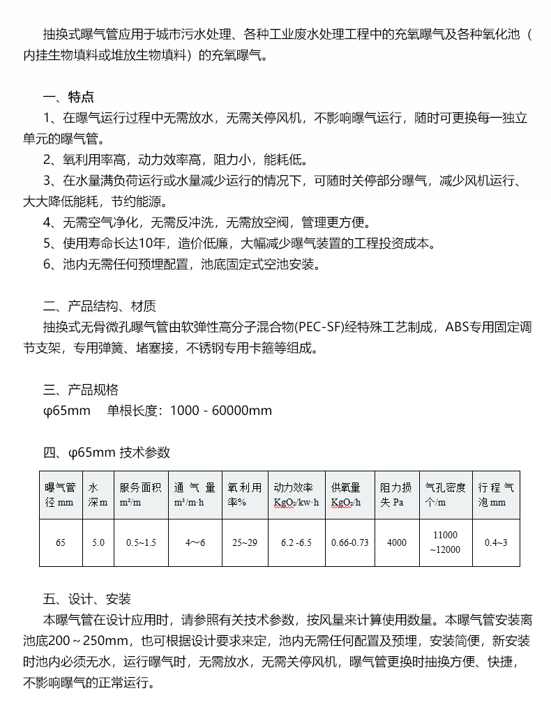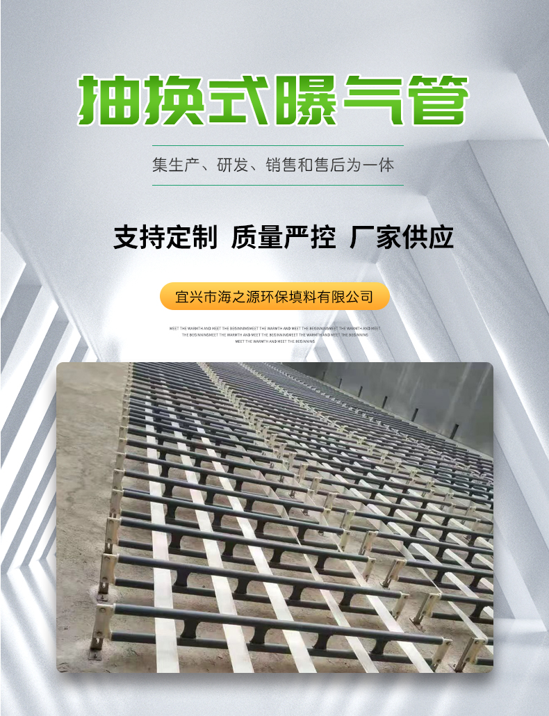 抽換式無(wú)骨微孔曝氣管由軟彈性高分子混合物(PEC-SF)經(jīng)特殊工藝制成,ABS專(zhuān)用固定調(diào)節(jié)支架,專(zhuān)用彈簧、堵塞接,不銹鋼專(zhuān)用卡箍等組成。